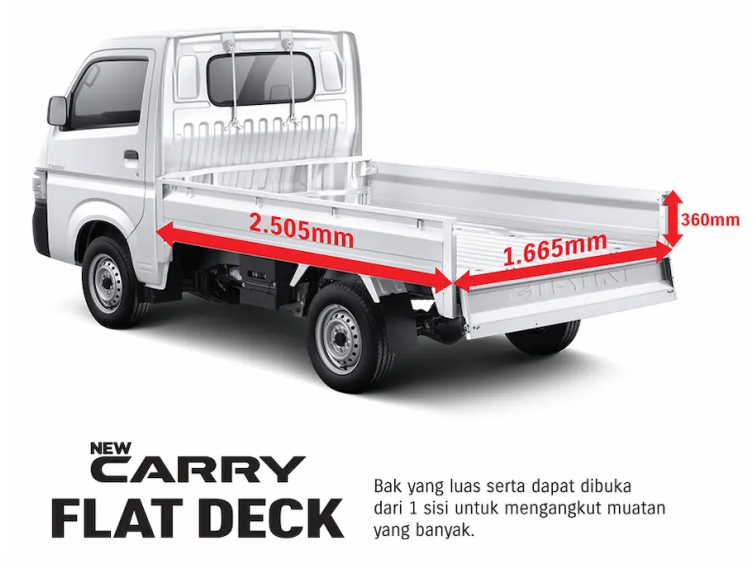 New Carry Pick Up kini dilengkapi dengan bak yang lebih luas dan sasis yang lebih kuat membuat kapasitas angkut hingga 1 ton. New Carry Pick Up hadir dalam varian wide deck dan flat deck yang lebih ekonomis dan dapat disesuaikan dengan bisnis Anda.